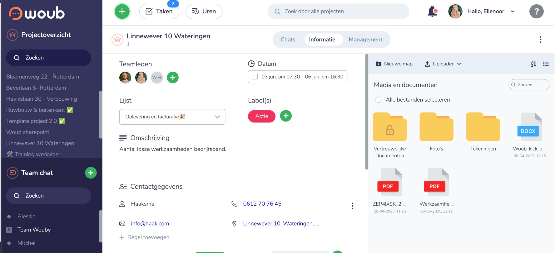 Op deze pagina houd je alle onderdelen van een project overzichtelijk bij: van teamleden en checklists tot media, documenten en notities. Het geeft een in één overzicht een beknopte en duidelijke instructie van de stand van zaken. Hieronder een aantal functionele onderdelen toegelicht:
